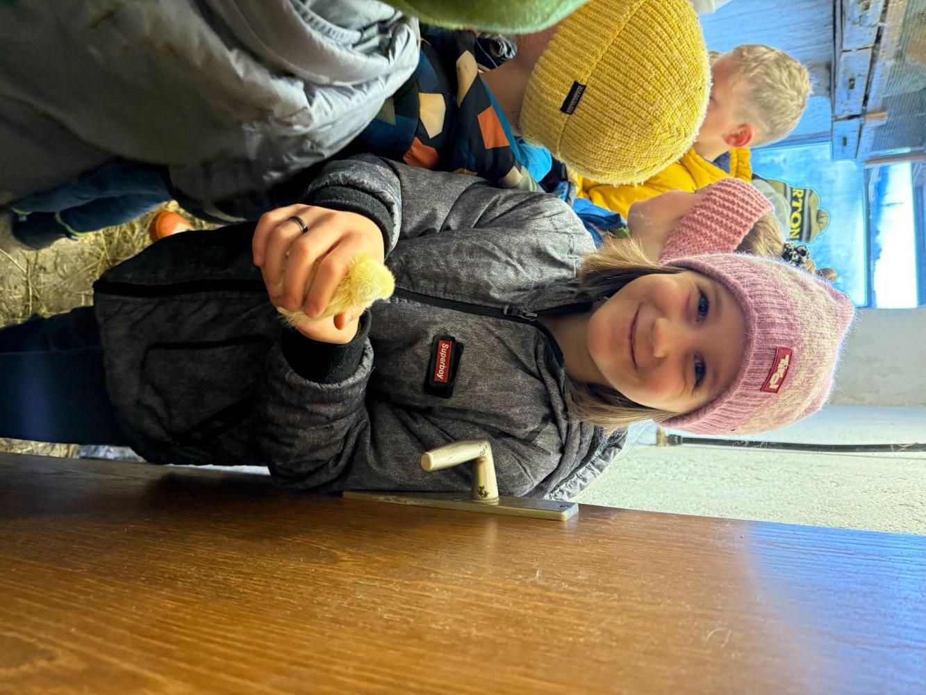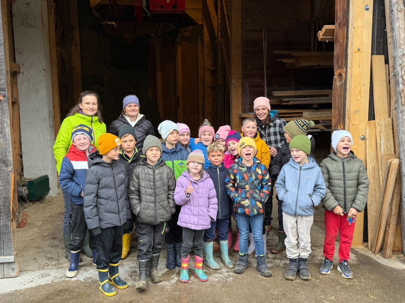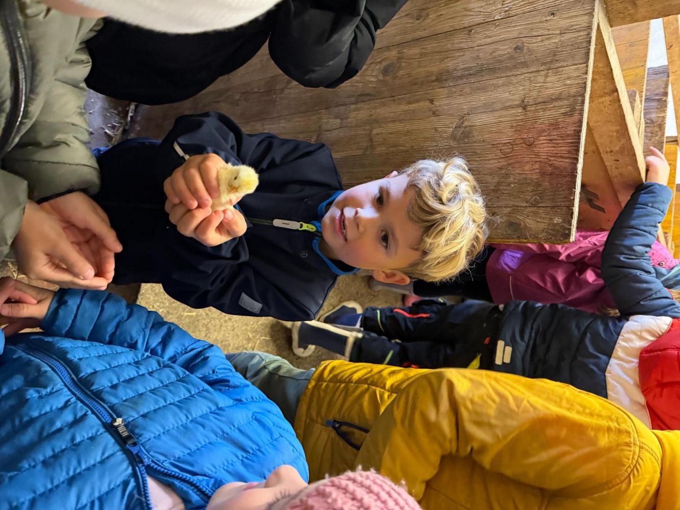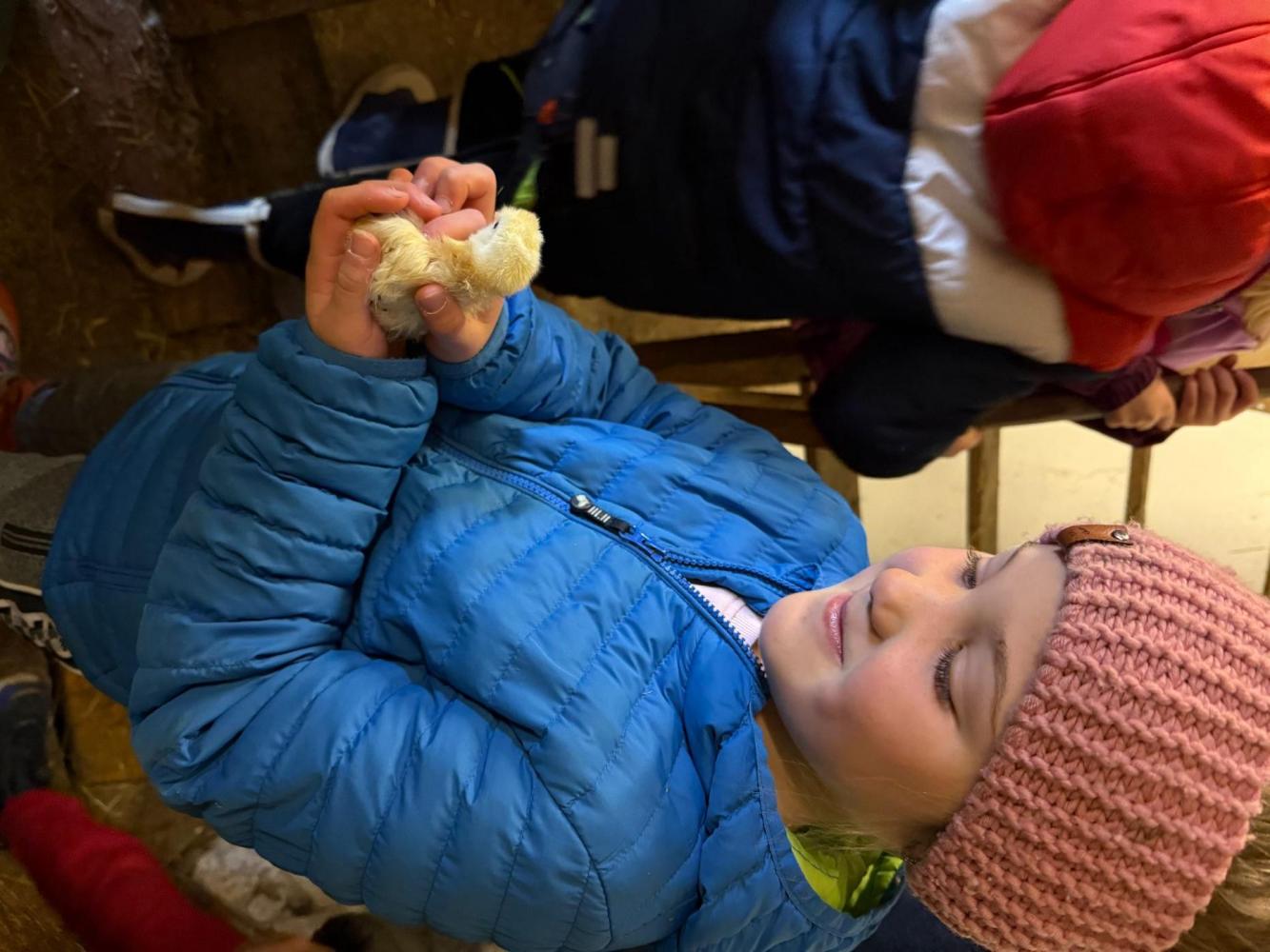 Zu Beginn stand ein Rundgang über den Hof auf dem Programm. Die Kinder besuchten Enten, Ziegen, Kälber und Kühe und erfuhren Spannendes über deren Haltung. Ein besonderes Highlight waren die frisch geschlüpften Küken: Die kleinen, flauschigen Tiere durften sogar behutsam gestreichelt werden. Anschließend ging es weiter in die Scheune, wo die Kinder einen Blick auf die Lagerung von Heu und Stroh werfen konnten.